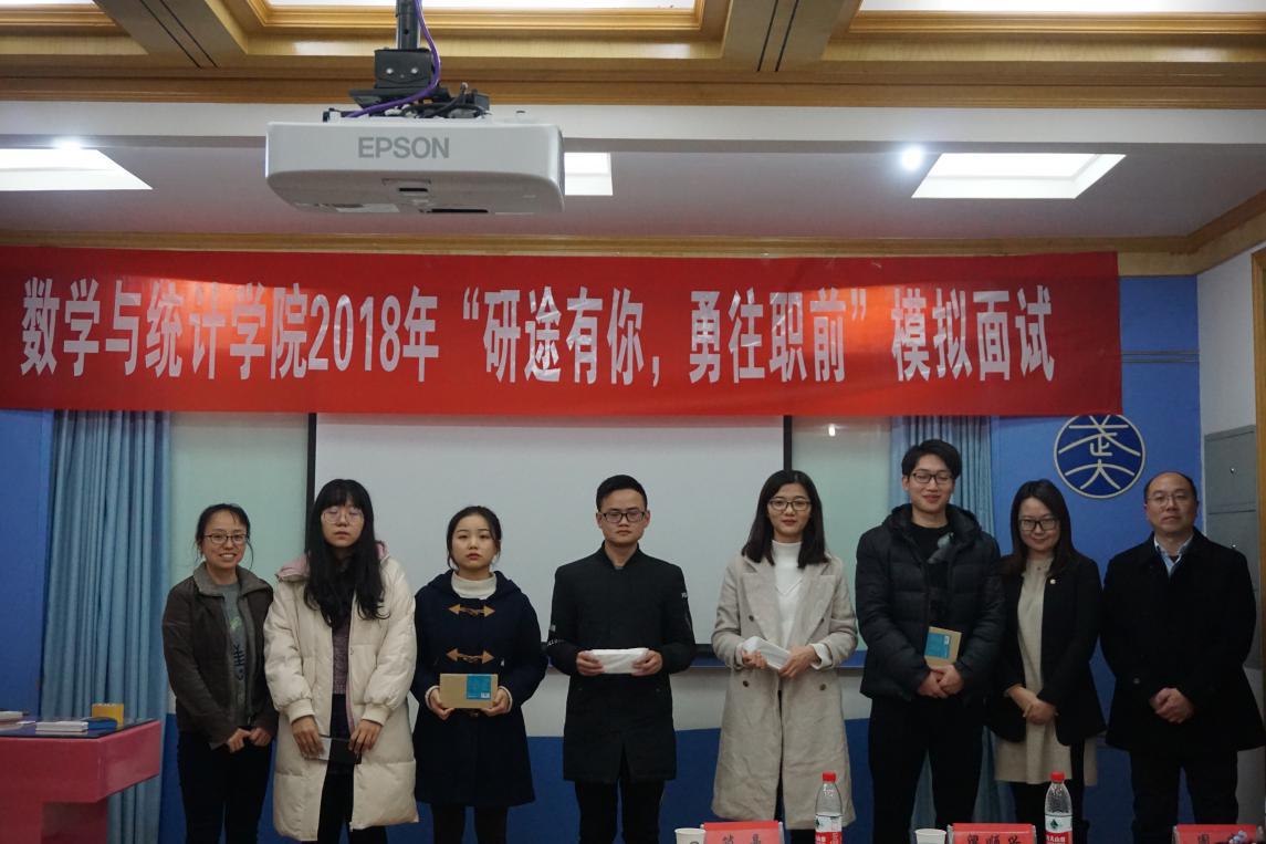 比赛得分统计完成后,主持人宣布了比赛的最终结果。本次比赛共设有一个一等奖,两个二等奖和两个三等奖。来自2017级概率论与数理统计专业的黄璐同学凭借自己优异的表现获得了本次比赛的第一名。最后,评委老师依次上台为所有获奖选手颁奖并合影留念,本次的“研途有你,勇往职前”模拟面试大赛圆满结束。