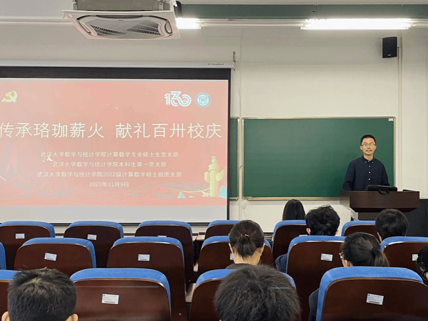 2022级计算数学硕士班团支部与计算数学专业硕士生党支部、本科生第一党支部联合举办党(团)日活动。本次活动以“传承珞珈薪火,共迎百卅校庆”为主题,邀请博士生宣讲团成员、文学院古代文学专业博士研究生李佳艺宣讲。活动由计算数学专业硕士生党支部书记王健主持。