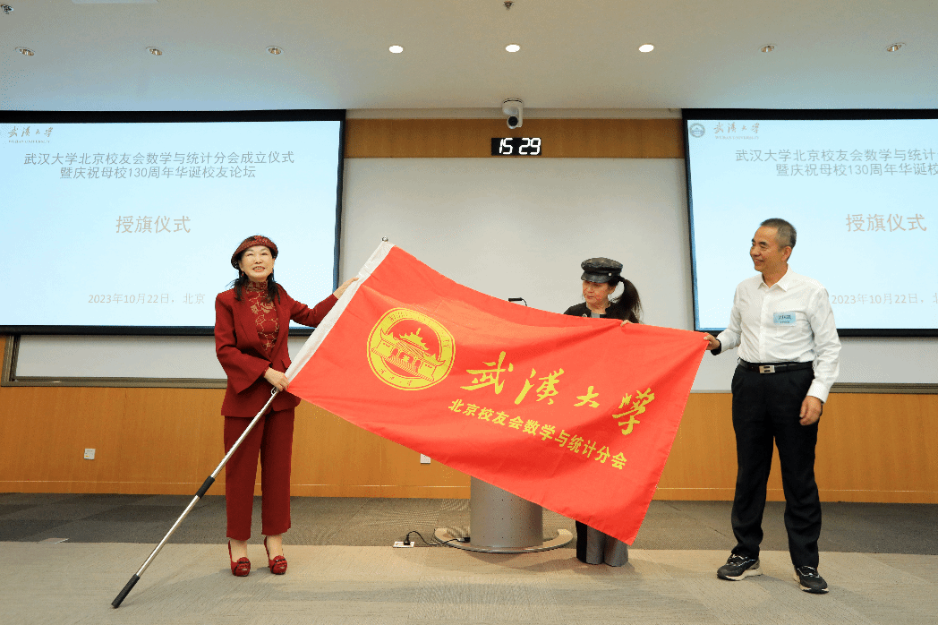 与会人员热烈鼓掌通过北京校友会数学与统计分会第一届理事会组成人员名单。银河证券原首席经济学家、1977级院友左小蕾担任会长,吴国凯、雷明、孙向红、龚六堂、汪小康、黄立虎担任副会长,吴国凯兼任秘书长。国务院参事室参事、1977级院友汤敏,中国人力资源开发研究会会长、国家发展和改革委员会社会发展司原司长、1979级院友欧晓理等多位资深校友担任特邀顾问。丁娟娟、许定波、徐刚、黄四民、张治国、许春晖等15人担任理事。喻杉代表北京校友会,为数学与统计分会郑重授予会旗。