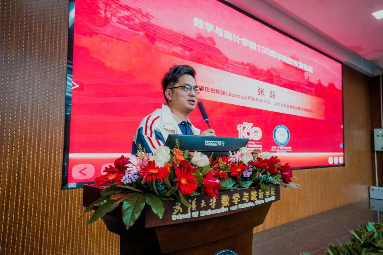 深圳校友会数学与统计分会会长、阿里巴巴集团Lazada公司执行副总裁、1996级校友张鼎讲述了深圳校友会数学与统计分会成立的初心愿景和筹建历程。他表示,校友会是凝聚校友力量、共享资源发展的重要平台。他介绍了自己在互联网行业的奋斗历程和感悟收获,鼓励学弟学妹们在校期间拓展知识面,加强外语学习,注重实践锻炼,不断提升综合能力。