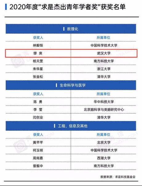 新闻网讯(通讯员伍轩)求是科技基金会官网日前公布了2020年度“求是杰出青年学者奖”获奖名单。此次共12人获奖,武汉大学数学与统计学院教授缪爽榜上有名。